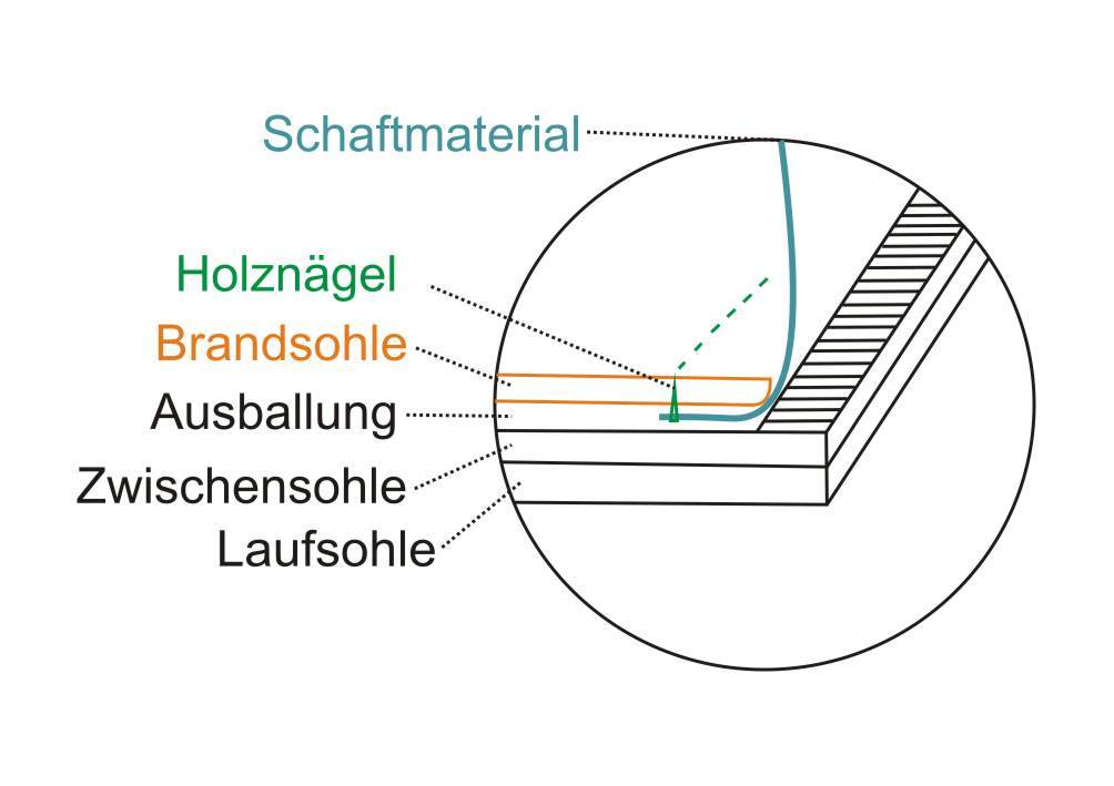 Bei holzgenagelten Schuhen werden Boden, Sohle und Oberleder durch kleine Holznägel miteinander vernagelt.